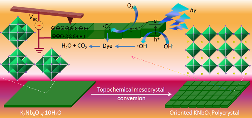 具有钙钛矿结构的KNbO3是无铅压电材料的杰出代表,其二维取向多晶在压电、催化、能量储存与转换等领域具有广阔的应用前景。然而,由于其高纵横比和择优取向性,二维KNbO3取向多晶难以制备。本研究以乙二醇-水为反应媒介,巧妙调配反应体系极性和粘性控制晶体成核速率,使用溶剂热法定向溶解沉积可控制备二维铌酸盐前驱体;再基于拓扑化学介观转变机制,采用煅烧方式处理二维铌酸盐前驱体,制备出具有[110]晶轴的二维KNbO3取向多晶。该二维KNbO3取向多晶由于高度取向,不仅表现出单晶性质,还具有取向纳米晶体的集体内增效应,因而呈现出优异的压电性能和光催化性能。该成果不但进一步补充和发展了拓扑化学介观转变机制理论,还为溶剂热法开发二维取向材料及其在压电和光催化领域的有效应用提供了新策略。(文、图/周妮妮 审核/胡登卫)
