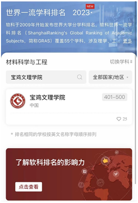近日,高等教育评价专业机构软科发布2023“软科世界一流学科排名”,公司材料科学与工程学科上榜,排名401-500。